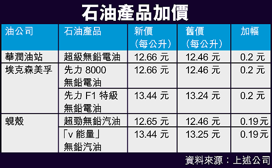 【本報訊】繼香港加德士後,蜆殼、埃克森美孚及華潤油站昨分別公布,今日凌晨零時起,調高車用無鉛電油價格(見表)。