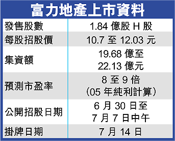 【本報訊】富力是廣州主要房地產開發公司之一,主力在廣州及北京開發中高檔住宅。據接近承銷團消息稱,派息比率是富力其中的賣點,預期約40%,由於在年中上市,按半年帳目計算,下半年度息率4.3%至4.8%,視乎招股價而定。