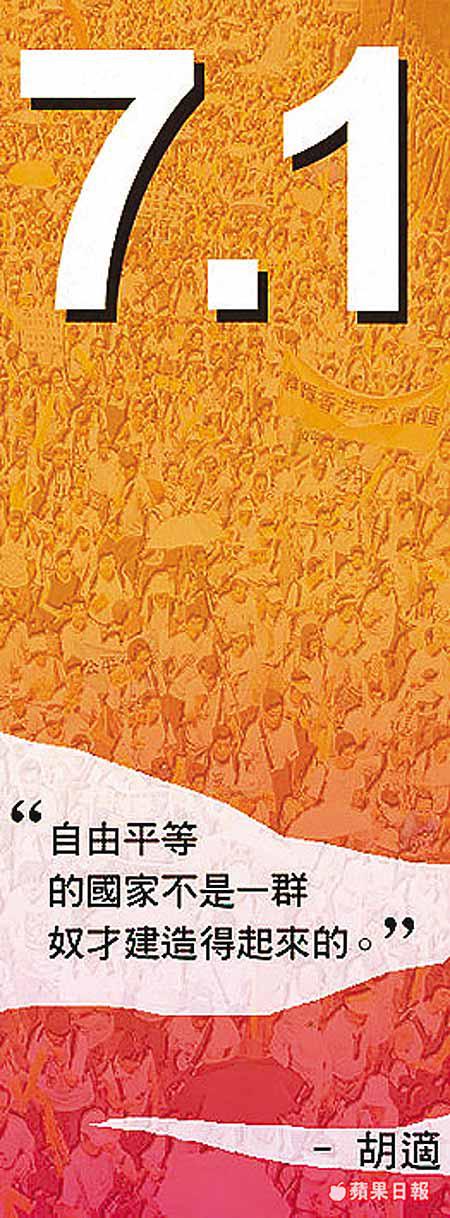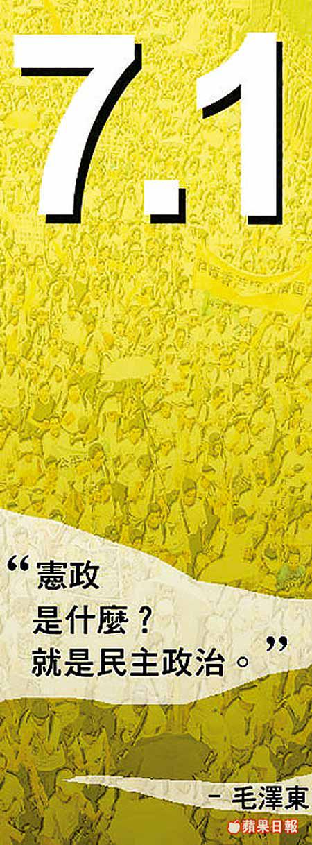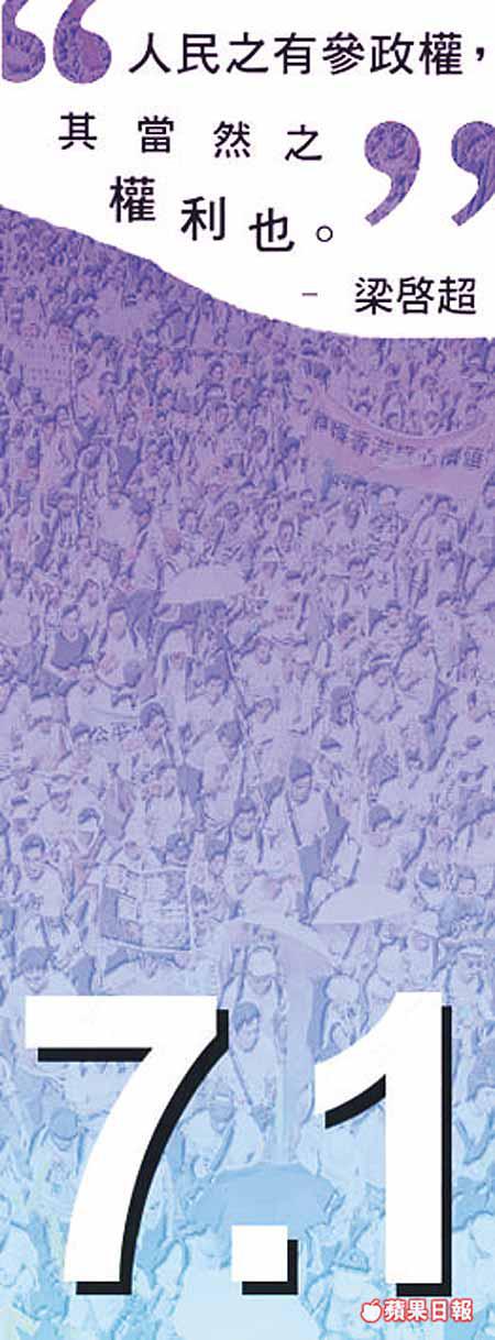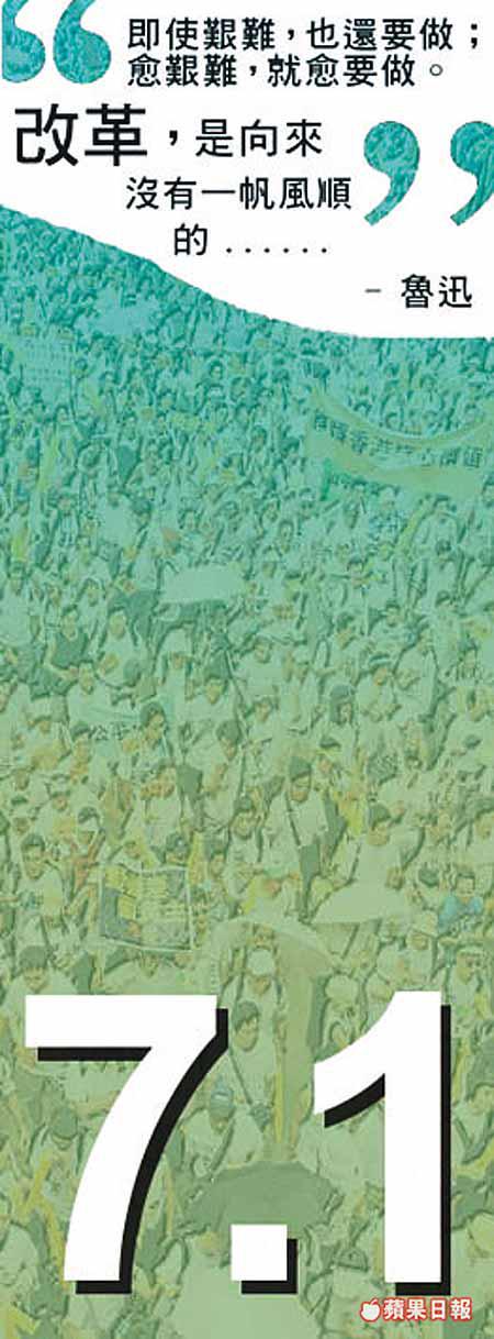 【本報訊】明日又到7.1大遊行的日子,過去兩年,逾五十萬港人在這天展示了人民力量,和平有序地上街爭取民主。縱使各界普遍看淡今年7.1上街人數,但多個政黨、專業界別、基層團體以至學生組織正作最後衝刺,號召港人明日一起「用腳投票」,為香港開拓「民主路」。《基本法》45條關注組成員湯家驊稱,未來半年是決定○七、○八選舉方案的關鍵時刻,「多啲人出嚟表達訴求,對爭取民主會好有幫助。」 記者:雷子樂