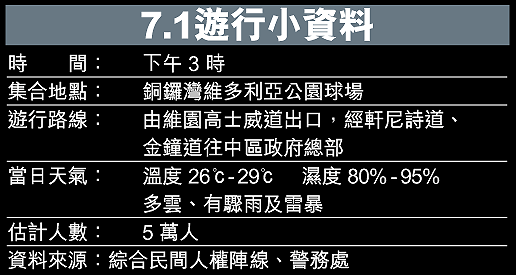 民陣估計明日的遊行人數約五萬人。劉業成表示,遊行在下午三時出發,估計兩時半開始會有大量市民進入維園,為免維園於短時間內「迫爆」,如有需要,會要求主辦單位提早出發。警方並呼籲中途加入的市民在波斯富街一帶加入遊行行列。