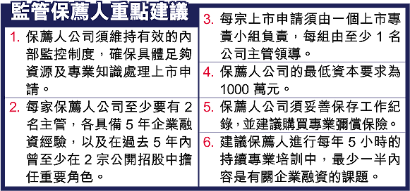 證監的建議包括,保薦人公司至少要委任2名主管,各具備至少5年有關企業融資的經驗,以及在過去5年內曾至少在2宗已完成的新股上市工作中,擔當主要角色。保薦人公司須維持1000萬元的最低資本要求。證監建議,保薦人公司應就其可能出現的法律責任購買專業彌償保險。