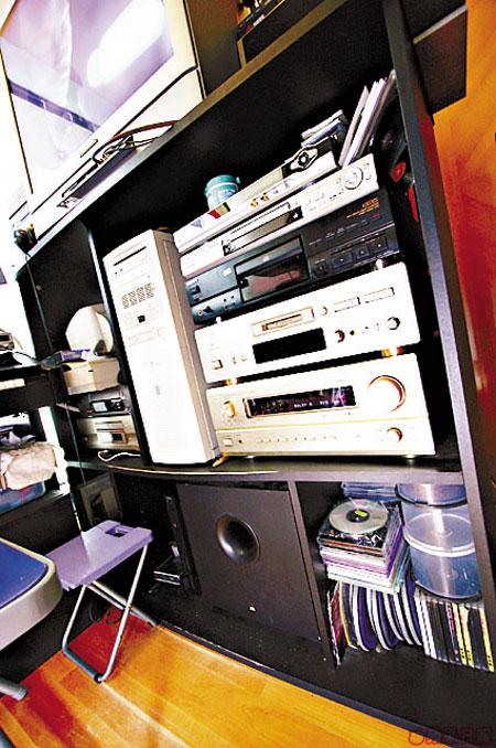 地方小,所以沒有甚麼地方安置影音器材,但是身為音樂人,對音響仍有一點點堅持,全部器材都要買原產地原裝產品,最有趣是看電視距離視線不夠三呎,阿媽看到一定會說壞眼,但Zoho一於少理,認為「聞」電視反而更有大銀幕Feel。