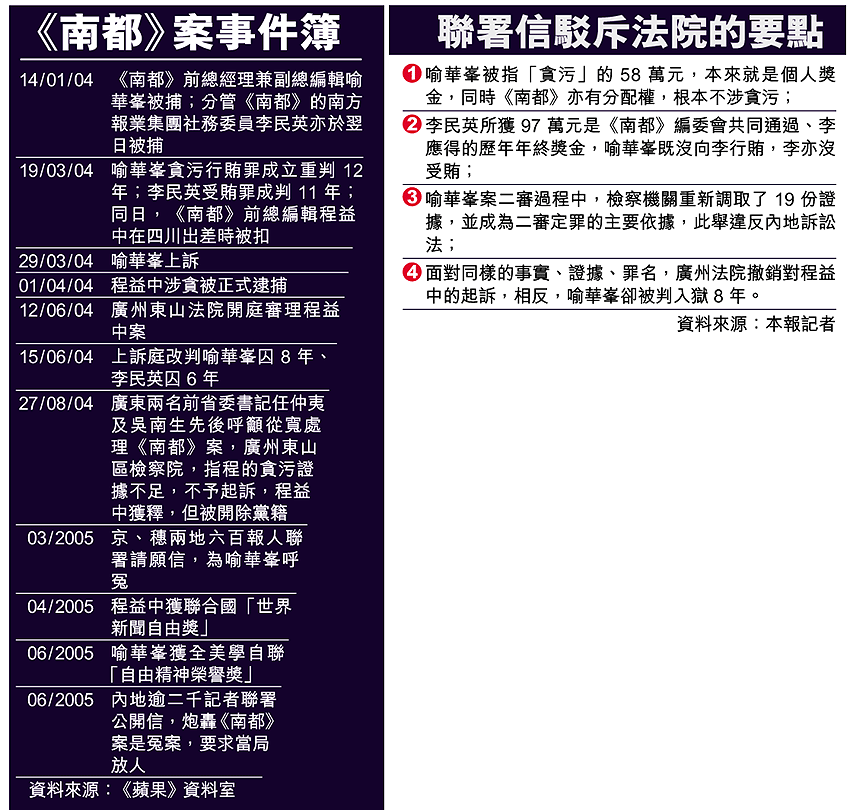 結果,廣州市中級法院去年以貪污罪及行賄罪,判處《南方都市報》原副總編輯喻華峯入獄八年,同時以受賄罪判處分管《南都》的南方日報報業集團社務委員李民英入獄六年。這次判決一度引起海外輿論嘩然,紛紛指摘判決是「莫須有」、「中國文字獄」等。