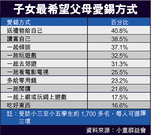 【本報訊】父母疼愛及照顧子女無微不至,但子女卻未必感受得到。一項調查發現,約七成母親及六成父親稱非常疼愛子女,逾四成家長認為給子女吃好東西是子女最希望的愛錫方法。但原來逾四成子女最希望父母送禮物給他們,更分別有百分之二點五及百分之五的子女給予母親和父親不及格分數。