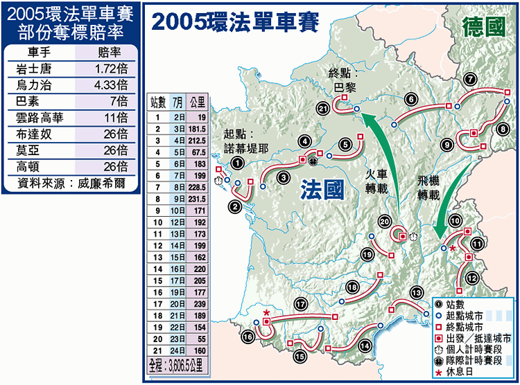 在過去六屆環法大賽前,岩士唐都能最少贏得一項賽事勝利,但今年卻一次也未能登上領獎台。上周三,在法國尼斯一場計時賽時更意外撞車受傷,被摔得眼黑臉腫、頭盔破裂。