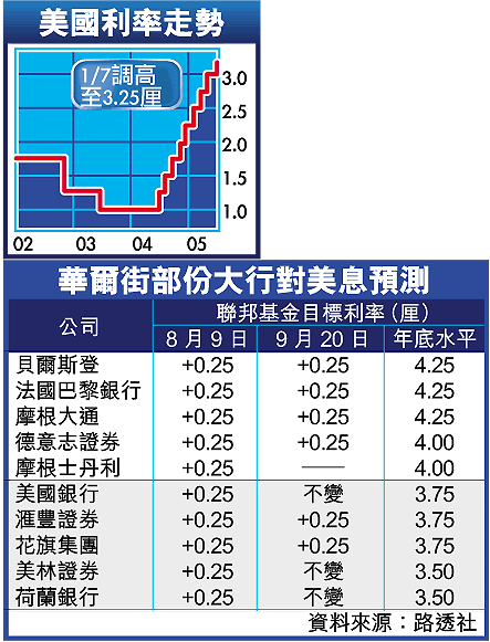 根據路透社在聯儲局議息後進行的調查,受訪的22家美國國債莊家交易商中,有21家估計FOMC在8月9日的會議上再加息0.25厘;14家大行則預測會在9月20日加息0.25厘(見表)。至於今年底的利率水平,各大行的預測從3.5到4.25厘不等,中位數為4厘。