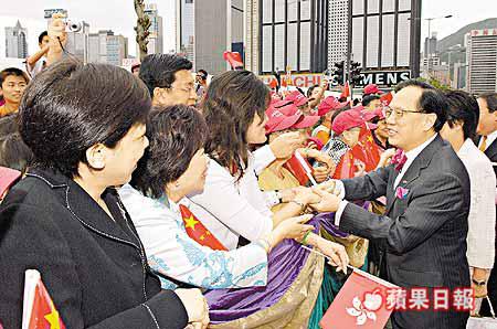 曾蔭權與政府主要官員、中聯辦官員及逾百名嘉賓,出席升旗儀式。其間曾蔭權不忘打親民牌,升旗前先走向公眾席與市民握手寒暄,之後才返回嘉賓席,曾蔭權太太鮑笑薇則不時為丈夫抹去額上水點,盡顯夫妻間的溫馨。