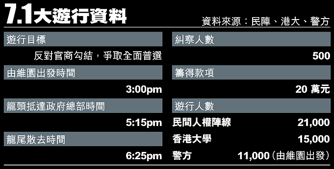 連日暴雨,市民都以為今年7.1要在雨中漫步,但這日三時許卻有短暫陽光,雨傘變成太陽傘,遊行人士一邊撐着傘,一邊撐開民主之路。主辦單位民間人權陣線估計,昨日有二萬一千人參加遊行,警方的統計數字為一萬一千,香港大學民意研究網站則估算出一萬八千至二萬一千人。籌款方面,民陣去年7.1籌得八十萬元市民捐款,今年也籌得二十萬。