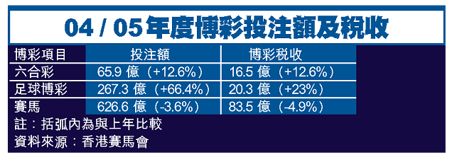 馬會前年八月開始營辦足球博彩,首年度即錄得一百六十億元總投注額,繳作稅款的毛利高達十六億元。隨投注形式愈趨多元化,在剛過去的○四至○五年度,足彩的投注額及博彩稅均錄得大幅增長,上年度每月平均投注額高達二十二億元,較前年上升五成三;每月平均博彩稅收亦達到接近一億七千萬元,較前年上升一成三。