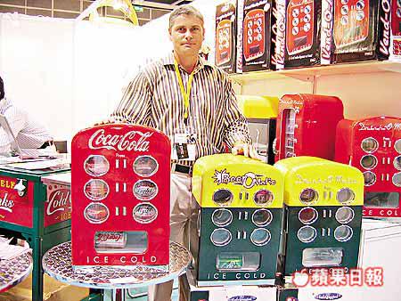 Timothy在港經營的SmartPlanet展出最新開發的汽水櫃,大部的可放12罐,設計仿效自動販買機,只要按掣汽水便會跌下,出口價約540港元。