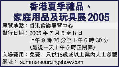 昨天報道的「香港夏季禮品、家庭用品及玩具展2005」共設5大主題展區,除了「禮品坊」,其餘4個展區包括「品味居室」、「時尚家居」、「餐廚廊」及「歡樂遊園」。當中展品涉獵範圍廣泛,但都環繞家居用品,着重實用之餘,也講求時尚及新穎設計,兩大設計主題正概括了來年家居用品發展的精髓。