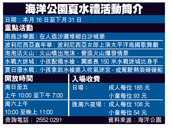 海洋公園「夏水禮」活動由本月十六日至下月底舉行,節目包括破天荒設立全港首個位於主題公園內的人造沙灘「南島沙樂園」,讓市民及旅客一家大小可以堆砌白沙城堡,並欣賞波利尼西亞女郎的草裙舞、鼓手及魔術師表演,陶醉於南太平洋島國怡人風光和歌聲之中。