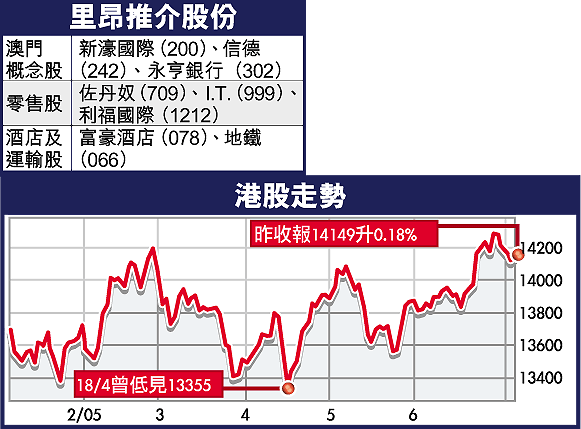 里昂證券昨日發表的研究報告,全面唱好香港及澳門兩地經濟。該行預期本港今、明兩年的經濟分別增長6.6%和6.5%;至08年恒生指數有望衝上2萬點水平。至於澳門博彩收入,該行預期在2010年達125億美元。港股昨日亦扭轉連跌4日的頹勢,上升25點。