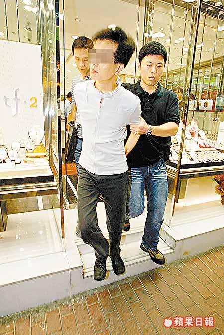【本報訊】旺角彌敦道周大福珠寶金行分店,昨晚七時許遭人「投彈」襲擊。一名三十餘歲男子闖入上址,將一個滿載天拿水的玻璃樽猛擲在地上,職員連忙按動警鐘報警(圖一)。旺角警區特遣隊趕至,當場制服該名男子(圖二)。警方稍後聯絡到被捕男子的妻子,對方表示丈夫三年前患上精神病,但一直拒絕服藥。 盧志光攝