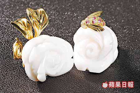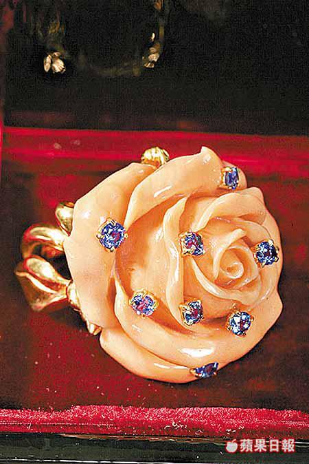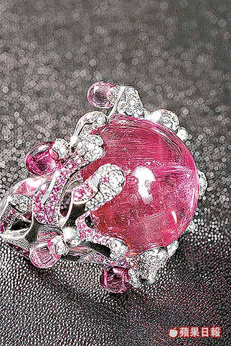 Victoire被拜占庭時代寶物的華麗風格啟發,把一枚她在意大利那不勒斯發現的渾圓珊瑚石,以大小不同、共重三十四點四五卡橙色石榴石,包裹鑲嵌成充滿中古藝術美學的戒指,令人讚歎不已。重達二十克的稀有粉橙色珊瑚石,被雕刻成細膩生動的玫瑰花,花瓣上鑲上細小晶瑩的藍寶石,恍如Mr.Dior在清晨時分於後花園摘下一朵沾滿露珠的玫瑰,意境浪漫。
