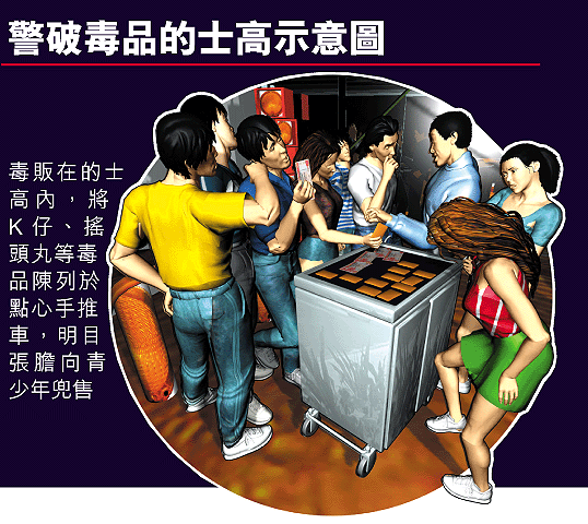 【本報訊】針對青少年濫藥問題嚴重,警方派出女警「放蛇」混入旺角區兩家的士高調查,首次揭發的士高職員涉嫌以點心手推車在舞池兜售K仔、搖頭丸等熱門精神科藥物,青少年放下金錢購買便可即時吸服,令的士高如同「毒品便利店」。警方前晚進行突擊搜查,拘捕十六名男女,撿獲約五萬五千元毒品及一批武器。 記者:黃曄寧、黃學潤