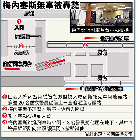 當倫敦警員上周五在斯托克韋爾地鐵站,用上格殺勿論的非常手段,向疑犯頭部近距離連轟五槍時,蘇格蘭場深信他們阻止了一次人肉炸彈襲擊。但當他們查明後,只能承認被警察開槍打爆頭的男子,其實不是跟他們之前說和7.21襲擊有直接關係,卻只是一名二十七歲青年,名字叫梅內塞斯,他只是一名普通電器技工,從巴西移居倫敦大約三年。