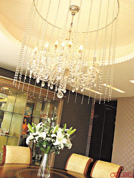 設計師Timothy稱駱太是水晶癡,一屋上上下下連射燈,共有6盞水晶燈!全屋最奪目當然是飯廳那盞巨型吊燈,是駱太在示範單位大堂見過環形水晶珠簾,於是靈機一觸,設計出內外兩重的水晶燈──內側是現成的大水晶吊燈,外環則找人串起一串串長水晶珠鏈,即成她現在不二家的水晶天地。