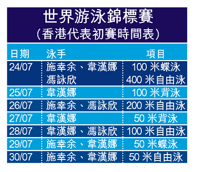 香港三名中學女泳手韋漢娜、施幸余及馮詠欣,周日陸續在加拿大蒙特利爾的「世界游泳錦標賽」中亮相;原本有份參賽的蔡曉慧,為了專心參加下月土耳其世界大學生運動會,決定放棄世界賽。