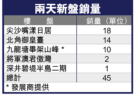 尖沙嘴漾日居減價及增設長成交期付款雙管齊下,兩日速售18伙,而北角御皇臺針對加息,推出定息付款,沽出14伙。市場上5個新盤,兩天共錄得45宗成交,從前周的逾20宗低位反彈。