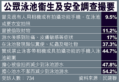 民建聯上月至今月初以電話訪問了七百三十四人,當中一成七人表示不滿泳池的衞生環境;近四成游水時曾發現池內有類似糞便、紅蟲及嘔吐物;一成七指泳後曾出現肚痛、皮膚敏感等症狀;五成四更指受池水不潔影響,會減少到泳池游水。