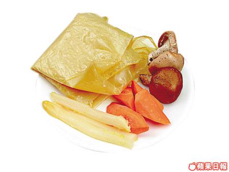 腐皮一張、冬菇5隻、紅蘿蔔80克、笋肉80克、西蘭花一棵