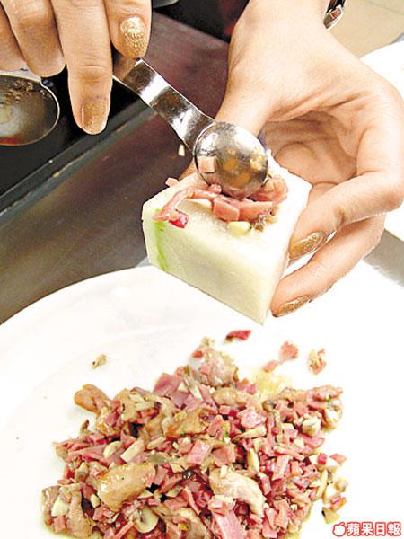 1.冬瓜切成方塊,將中間瓜肉挖空。瘦肉切絲,加調味料醃15分鐘。