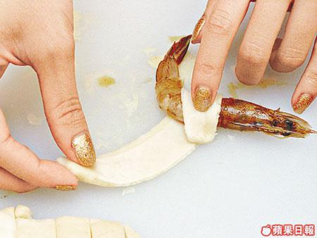 酥皮應盡量壓得薄薄,否則包捲蝦身時會因過厚而脫落。