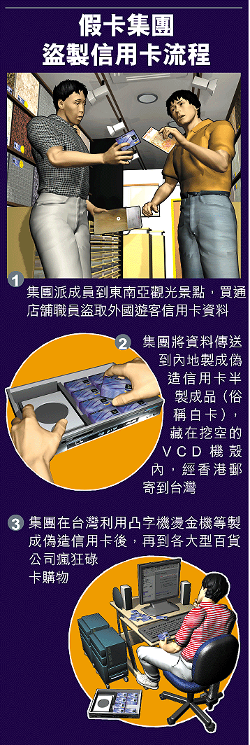 【本報訊】台北消息:一個活躍於中港台、由港人主腦操控的假卡集團,過去五年盜取及偽造大量信用卡在台灣瘋狂「碌卡」;這名被形容為「偽卡教父」港人主腦前日與兩名同黨前赴台灣,會合兩名當地同黨在百貨公司碌卡百萬元新台幣(約二十五萬港元)購物時,台灣警方採取行動將集團搗破,連同主腦在內五名集團成員悉數被捕。