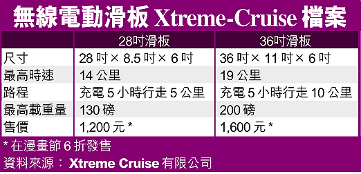 他稱,公司研製的無線電動滑板稱「Xtreme-Cruise」,中文稱「極速漫遊板」,暫時只有兩種尺寸,一為適合初中學生、最高載重量一百三十磅的二十八吋長滑板,以及最高載重量達二百磅的三十六吋長滑板。