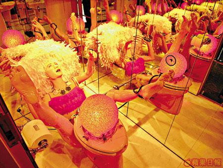 京都美術家森村泰昌的作品「輪舞」。他的作品以復製、模擬和錯位著名,好似這個非男非女的人,為何在洗手間內張開雙腳,不同的鏡製造不同角度的影像,不同人有不同的銓釋,有點後現代Feel!