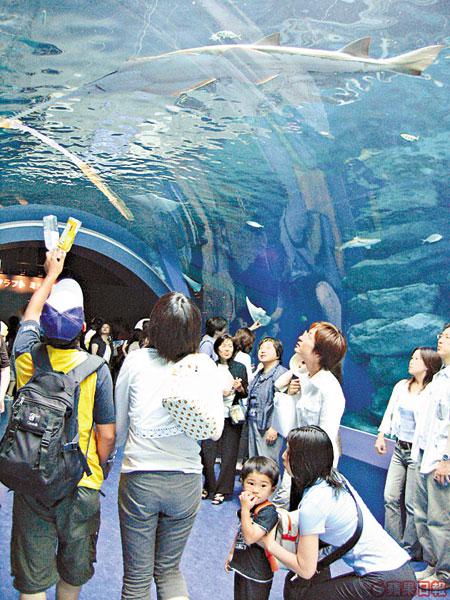 2:00pm,在美術館午膳後,行回水族館,人龍仍在,幸好人潮去得甚快,不消15分鐘便入場。初時,覺得人人貪新鮮,所以到此一遊,怎知,行入去,不但見到色彩繽紛的熱帶魚,還有一個光猛的露天水槽,養了數條懶惰的劍鯊,常常躲在槽頂睡覺,所以人人話咁易就可捕捉其神態,不像其他魚般,搏命游來游去,難拍照留念!