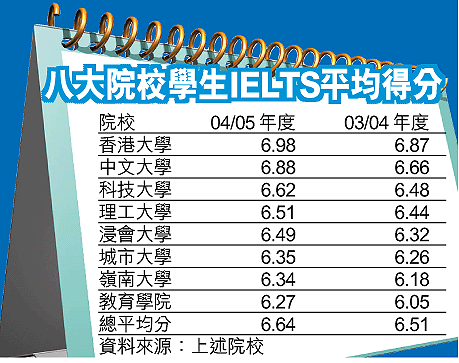 【記者梁美寶報道】八大院校畢業生今年應考「國際英語評核試」(IELTS)的成績公布,其中以香港大學學生的成績最好,以九分為滿分,學生平均得分達六點九八分,更有三名狀元獲得九分滿分;教育學院則以六點二七分排名榜尾。有僱主表示,滿意本港學生今年的成績,並表明IELTS考試成績將成為大學生求職的必要條件。