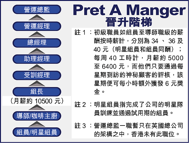 本港的連鎖咖啡店各佔山頭,來自英國的PretAManger於02年引入香港,以新鮮即日製的三文治做賣點,為應付不斷擴充的分店,需不時增聘人手,3年前首批獲聘的前線員工TeamMember就有不少大學畢業生,初期大家都要拿起地拖做清潔,但今天已晉升為管理階層。
