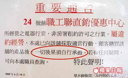 本報記者日前到梨木樹邨商場了解情況,見商場內告示板貼滿通告,點名指商場內五家店舖違約經營(見表),其中四家均是違例經營的電器店;通告又提醒顧客在該些店舖購物,「一切後果須自行承擔」。