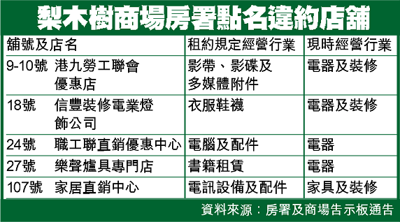 葵涌新落成入伙重建公屋梨木樹邨,商場共有五家店舖違反租約規定,經營非指定行業。新入伙居民向本報投訴稱,屋邨商場設有不少電器店,居民初時不以為意,早前卻發現商場內告示板貼滿通告,指商場內有五家店舖,不依租約規定經營,但這些被房署點名指控的店舖,仍繼續營業。