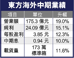 其他業務方面,東方海外位於北美的4個貨櫃碼頭,上半年共處理113.7萬個標準箱,增長15.6%,稅前盈利1.77億元,上升7%。
