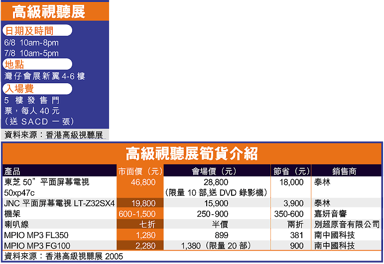 【本報訊】因電影《無間道》而更為人認識的「膽機」等高級視聽產品,已成為講求生活享受的港人必備家電;一連三天的香港高級視聽展昨首日吸引四千多發燒友到場,爭相試聽多款全球首度曝光、售百多二百萬元的音響,而半價的Plasma電視、喇叭線等,也吸引內地發燒友前來掃貨。 記者:黃嘉寶、翁煜雄、蔡朗清