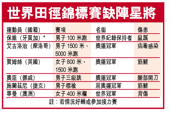 縱使今屆世錦賽群星缺陣(見附表),但對中國人而言,劉翔在陣已夠「睇頭」;但劉翔今年成績普通,十佳成績僅佔其一,更曾見負阿倫莊遜及擁有今年最佳時間十二秒九七的杜哥尼。