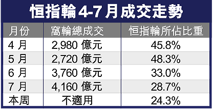 若以恒指窩輪佔整體窩輪成交之百分比計,恒指窩輪近期之成交確有下調的情況(見下表)。但投資者不用覺得奇怪,此乃正常之現象,試想想上半年個別正股未見有特別消息出現,而恒生指數亦持續處於牛皮上落格局,投資者自然較多利用恒指窩輪去捕捉大市方向,甚至是大市之短期波幅,形成短線資金流向指數窩輪。