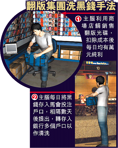 海關特遣隊監督陳志洪昨在記者會上稱,該翻版光碟集團主腦屬智慧型犯罪人物,懂得很多方法逃避追查,令關員調查時加倍困難。由於集團每日會有一萬元或以上純利從翻版光碟店舖中獲得,若不時存入銀行會引起懷疑,他們遂直接將現金存入馬會投注戶口,過數天後才再轉存銀行多個戶口內,當作是贏錢得來。主腦以日薪兩百元聘請雙程證人士作生產、包裝和運輸工作,一來價廉,二來即使被捕也不用支付安家費,再者他們對集團所知有限,容易提防。
