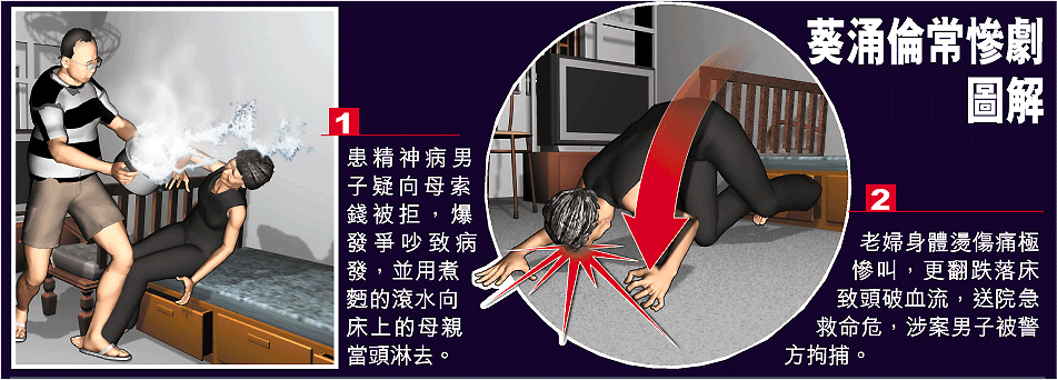 【本報訊】葵涌麗瑤邨一名逆子,懷疑向母親索錢不遂,昨日用煮麵的滾水向年邁母親照頭淋,老婦遇襲身體多處嚴重燙傷,痛極翻滾落床致頭破血流,發出慘叫驚動鄰居,警方接報將涉嫌傷人、患精神病兒子拘捕,老婦送院急救情況一度危殆,及後轉趨穩定。 記者:吳國威、劉柏麟