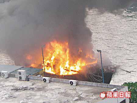 【本報訊】一艘漁船昨傍晚在香港仔避風塘疑洩電失火焚燒,烈燄及黑煙沖天,連落日也被遮蔽。水警聯同消防船及海事處船隻封鎖海面灌救,一小時後將火撲熄,火警中無人受傷。肇事漁船付諸一炬,只剩下一個船殼。