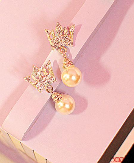 鑲上大小不一閃石的皇冠,吊珠大大粒甚為搶眼,唔想太誇張的話,不妨單戴這對耳環,已夠睇頭。