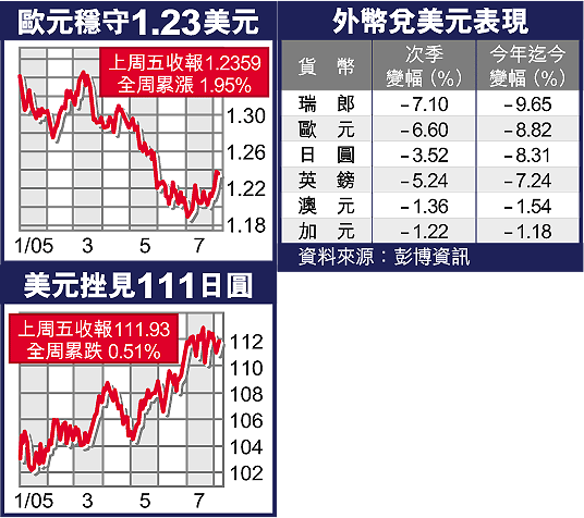 由於美國就業報告理想,歐元上周五回吐,但最後僅微跌0.25美仙,收報1.2359美元。全周計,歐元累升1.95%,是超過8個月來最大升幅。美元兌日圓表現相對較佳,上周五升至111.93,升0.69日圓;全周累跌0.57日圓(0.51%)。