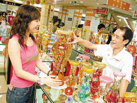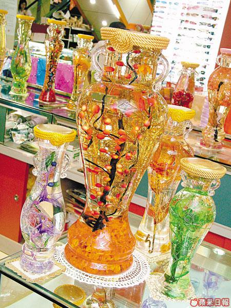 如果想買一些禮物給較年長的朋友,又或者想在家中加一些特色的擺設,可以看看這種由北京、上海流行到深圳的「水晶花瓶」,聽說擺放這種花瓶,有如放水晶,老闆透露有些香港的風水師傅都來過購買,據稱紅色代表喜慶、紫色有助家庭幸福、綠色可以增加運氣、橙色的開運金果和黃色的花都可以招財。花瓶裏面有些保鮮油,用來確保瓶內的裝飾永不變色。