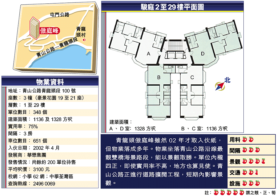 青山公路豪景花園第3期其中3幢,命名為傲庭峰,位處豪景花園最後排,地勢最高,中高層單位,每戶均享青馬大橋海景,部份單位,更享青馬大橋及汲水門橋雙橋景觀。