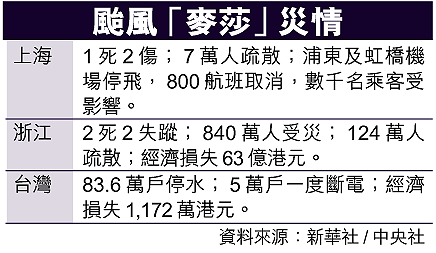 颱風「麥莎」昨肆虐華東,兩度在浙江登陸,重創浙江,全省五分一地區受暴雨襲擊,溫州、台州頓成澤國,部份地區水深兩米,上萬畝農田被淹,暴雨又引發山泥傾瀉,至少造成三死兩傷、兩人失蹤,一萬三千多間房屋倒塌,八百四十萬人受災,經濟損失高達六十三億港元。
