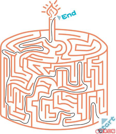 今天是王子丁丁的生日,一眾好友送他一個大大的生日蛋糕,當他點着蠟燭時,神奇的事件發生了!蛋糕竟然變成迷宮,各位小朋友,不如幫幫丁丁,為他找尋正確的出路。