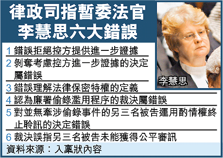 律政司昨在入稟狀列出區域法院暫委法官李慧思所犯六項錯誤,包括錯誤理解法律保密特權。律政司指,由於廉署已向特赦證人解釋其特權,對方放棄並默許被監察錄音,而案中第三被告與律師會面時容許特赦證人在場,代表同樣放棄特權,加上控方不會向其他人洩露對話內容,李慧思並無就該段錄音作出評估,以決定是否涉及有關特權。